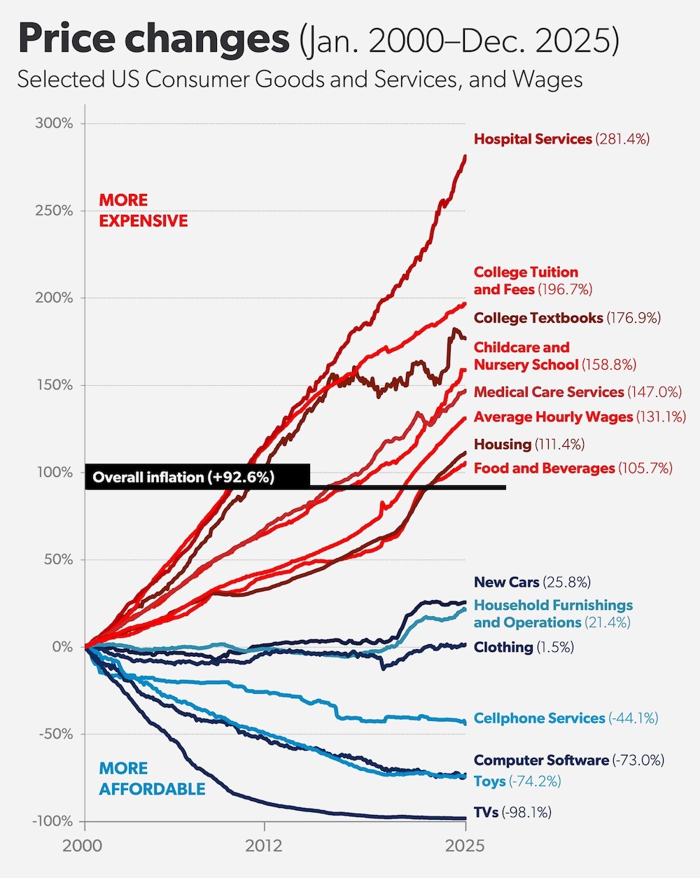 Reposant sur les données du Bureau of Labor et prenant en compte les valeurs rapportées du temps de travail plutôt que du prix absolu ‑pour une comparaison plus juste‑ le dernier graphique datant de décembre 2025 indique tout d’abord que l’inflation a augmenté de 92,5% ces 25 dernières années.