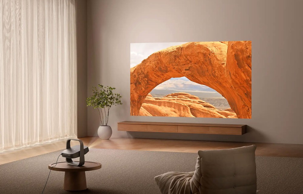 Le projecteur embarque des haut‑parleurs Harman Kardon compatibles Dolby Audio et Dolby Digital Plus pour une puissance maximum de 7 watts. Google TV est intégré, donnant accès directement à Netflix, Prime Video, YouTube et autres services de streaming sans boîtier externe. La connectique comprend deux HDMI (dont eARC), deux USB‑A. Sont également présentes les compatibilités Bluetooth 5.2 et Wi-Fi 6. L’appareil nécessite une alimentation secteur, aucune batterie n’étant intégrée.