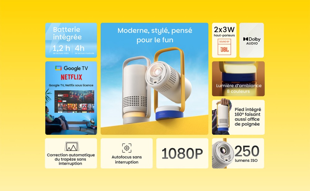 Pour le reste, ce spécimen 1 080p embarque le système d'exploitation GoogleTV (il offre donc un accès direct à Netflix). Il est équipé d’un support orientable à 160° (pour projeter du mur au plafond), de réglages de trapèze et de mise au point automatiques, ainsi que d’une poignée pour le transport. Les fonctionnalités Bluetooth et Wi‑Fi sont présentes, de même pour les ports USB‑C et HDMI. L’autonomie monte à 1,2 heure de lecture vidéo ou 4 heures de musique, et le pic lumineux est donné pour 250 nits.