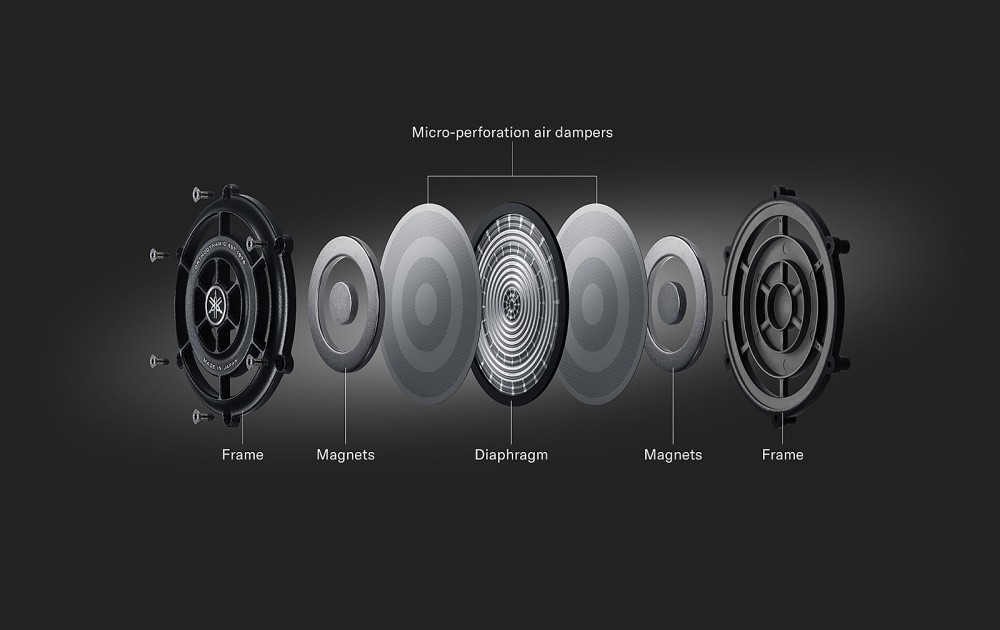 La technologie de haut‑parleur magnétique planaire Orthodynamic introduite par Yamaha dans les années 1970 poursuit son chemin avec une version modernisée, équipant le diaphragme (forme ronde) de bobines conductrices des deux côtés, ainsi que de motifs finement ondulés en forme de vagues sur leur surface. En résultent des haut‑parleurs plus légers qu’à l’accoutumée, restituant davantage de détails sonores. À noter aussi des amortisseurs à micro‑perforation sur les deux côtés pour contrôler le mouvement de l’air. Le YH‑4000 est également équipé d’un nouveau filtre à mailles en PET (matériau technique ‑polyéthylène téréphtalate‑ tissé) qui régule la pression interne de la coque, et on trouve une protubérance en forme d'arche qui agit comme un réflecteur afin d’améliorer la précision sonore.